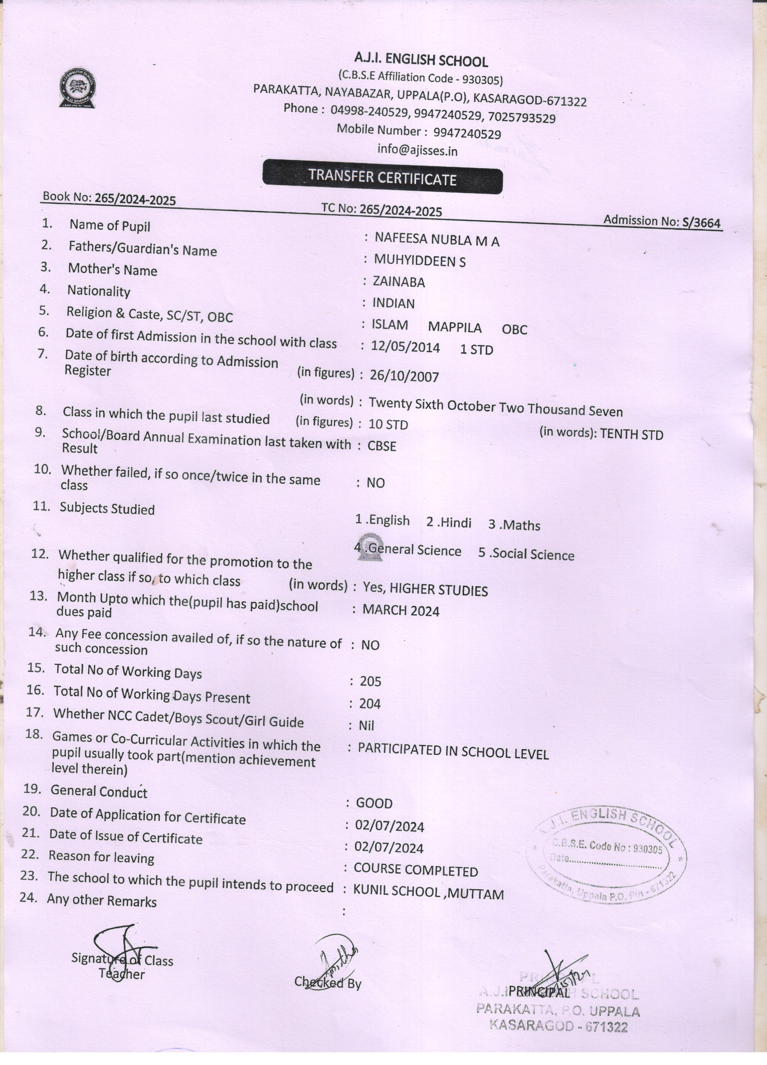 | 282. | NAFEESA NUBLA MA | TC NO.265/2024-25 | View |