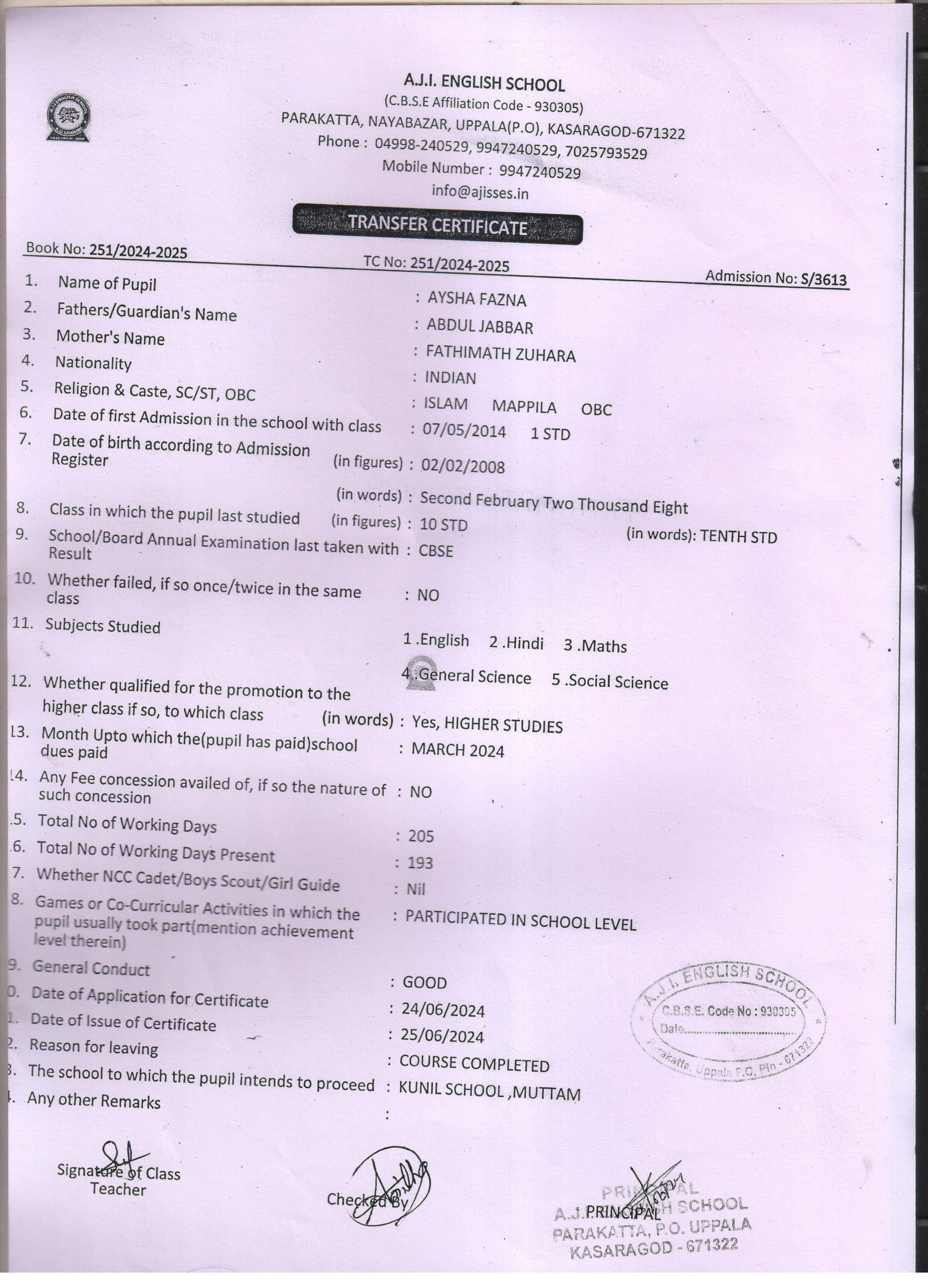 | 283. | AYSHA FAZNA | TCNO.251/2024-25 | View |