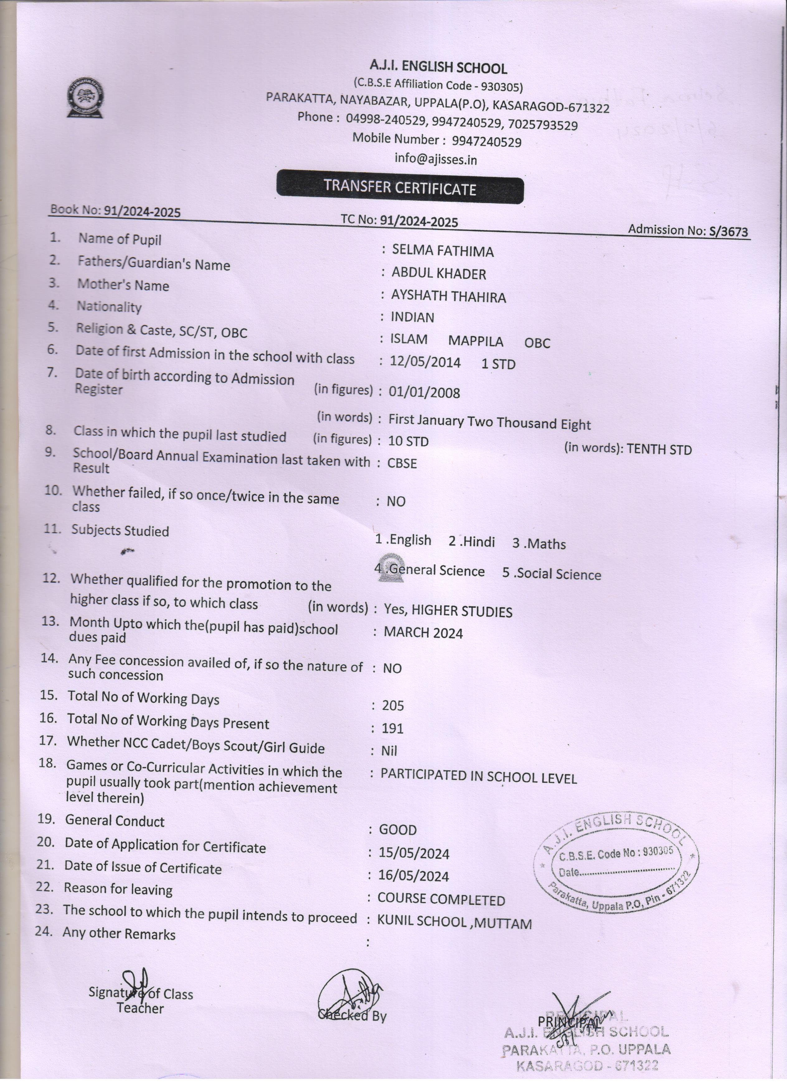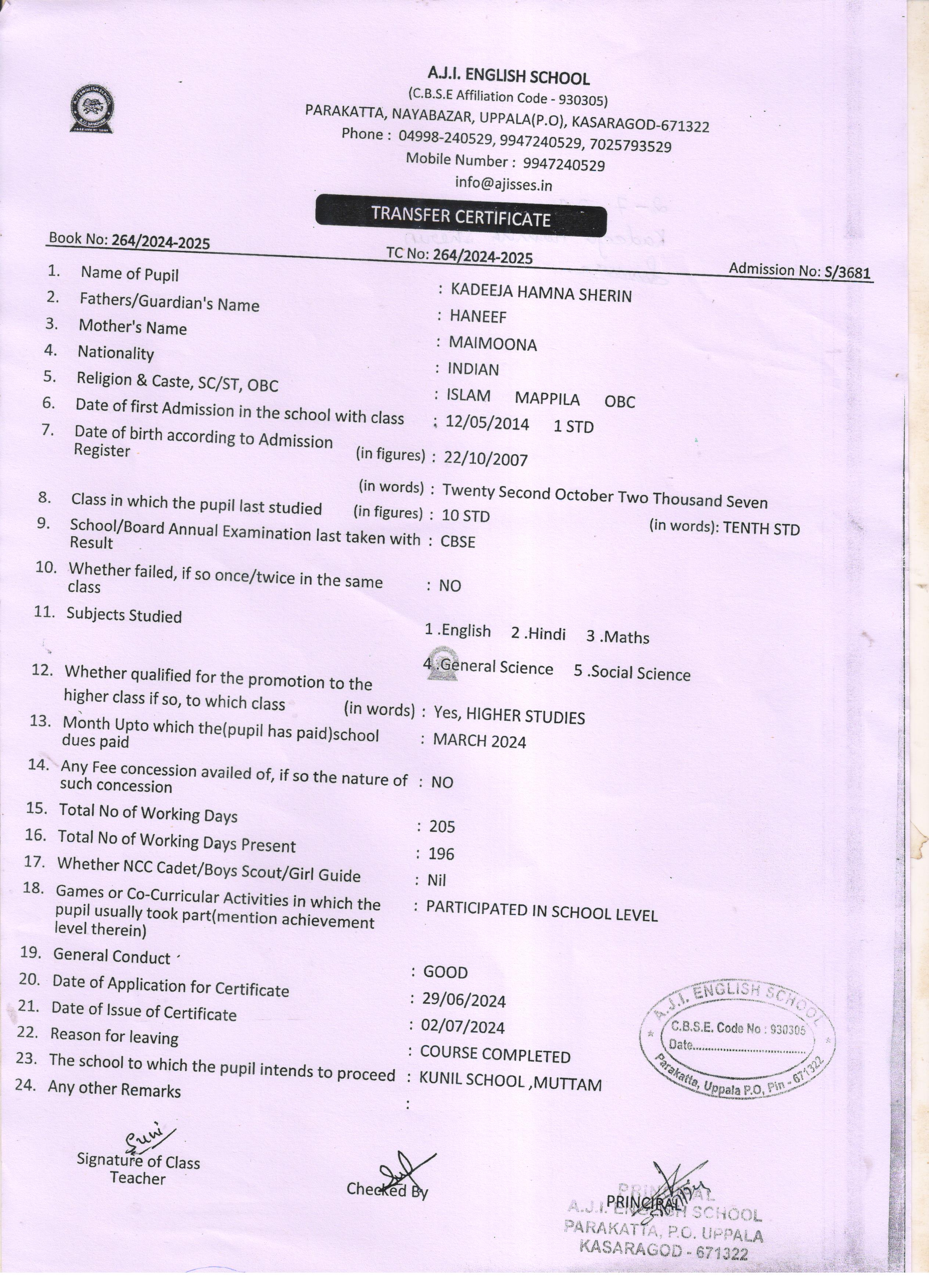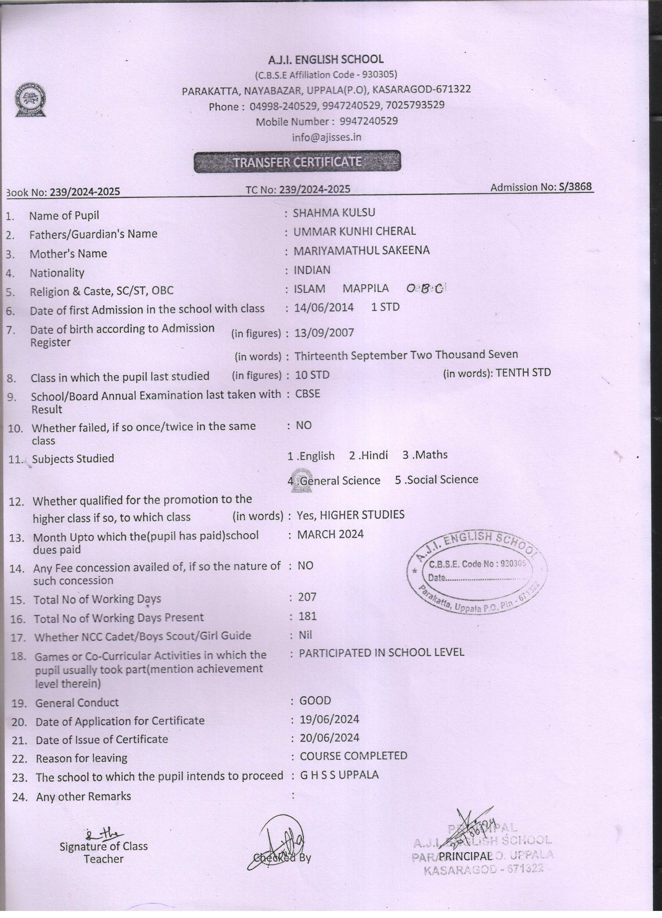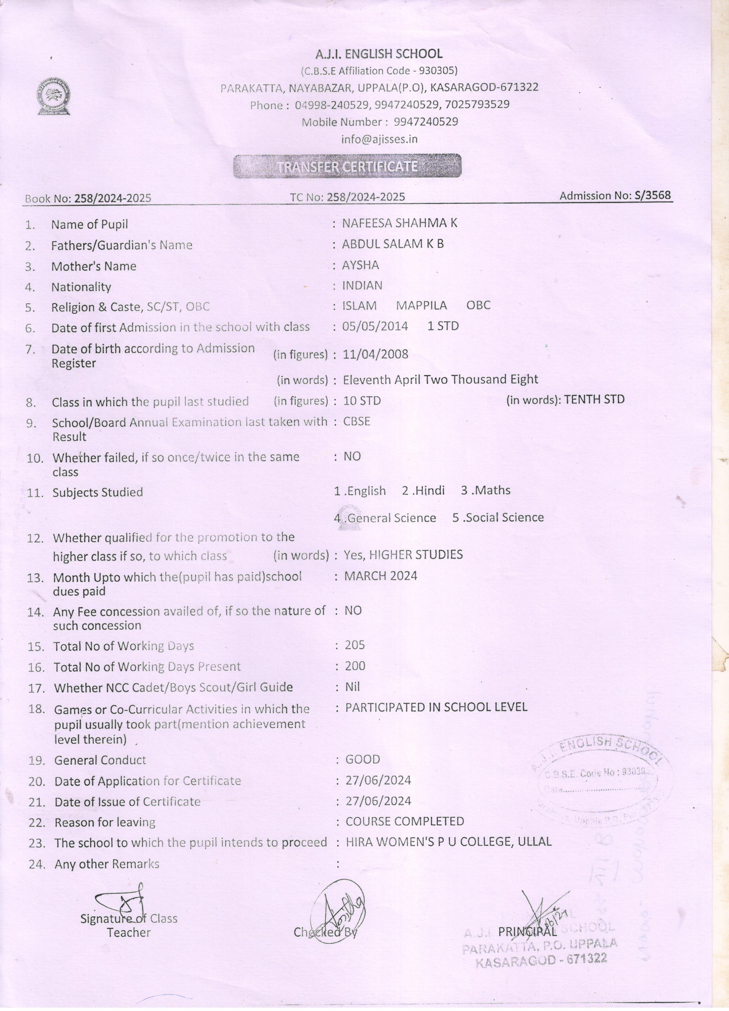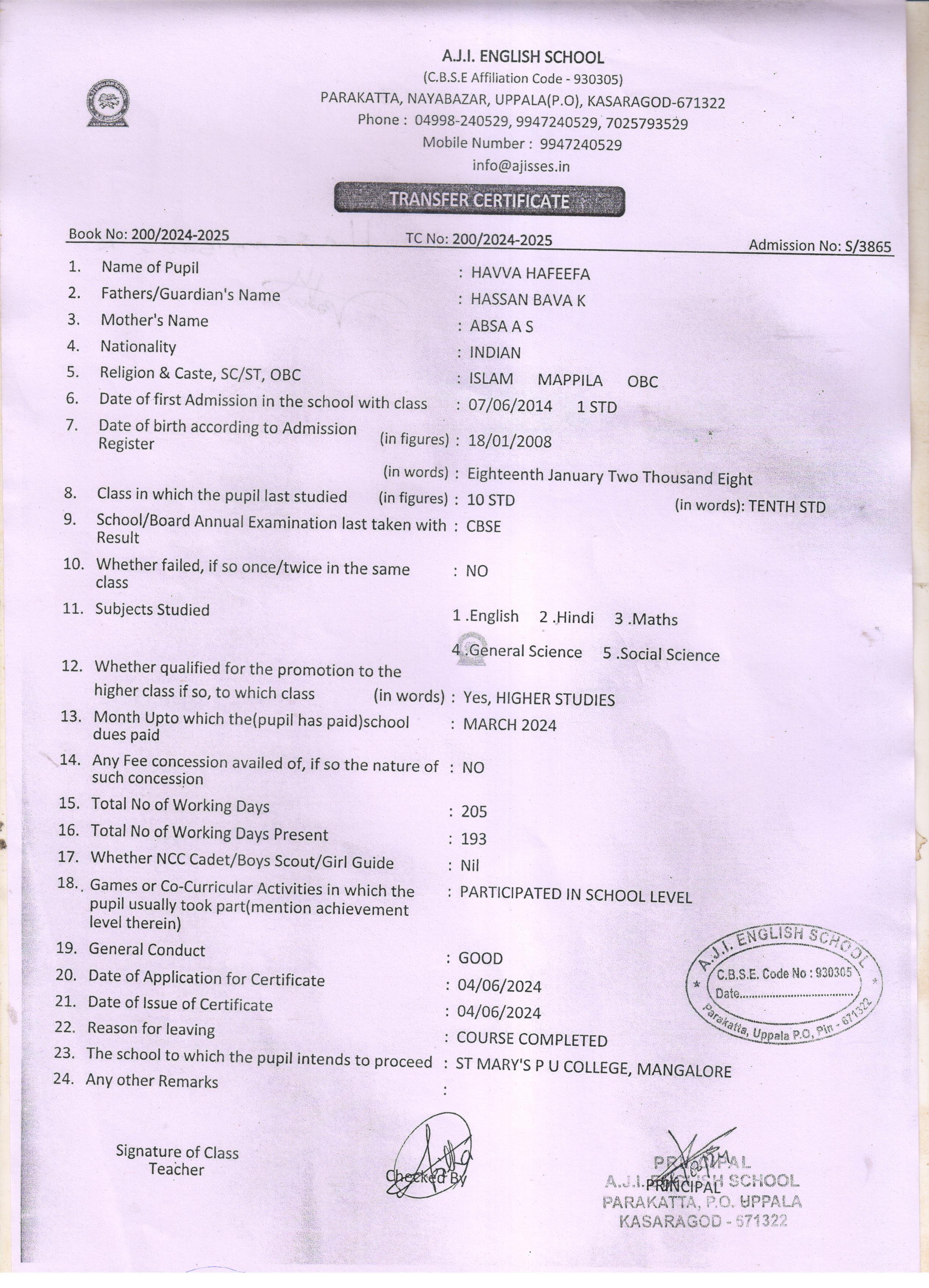 | 293. | HAVVA HAFEEFA | T C NO.200/2024-25 | View |