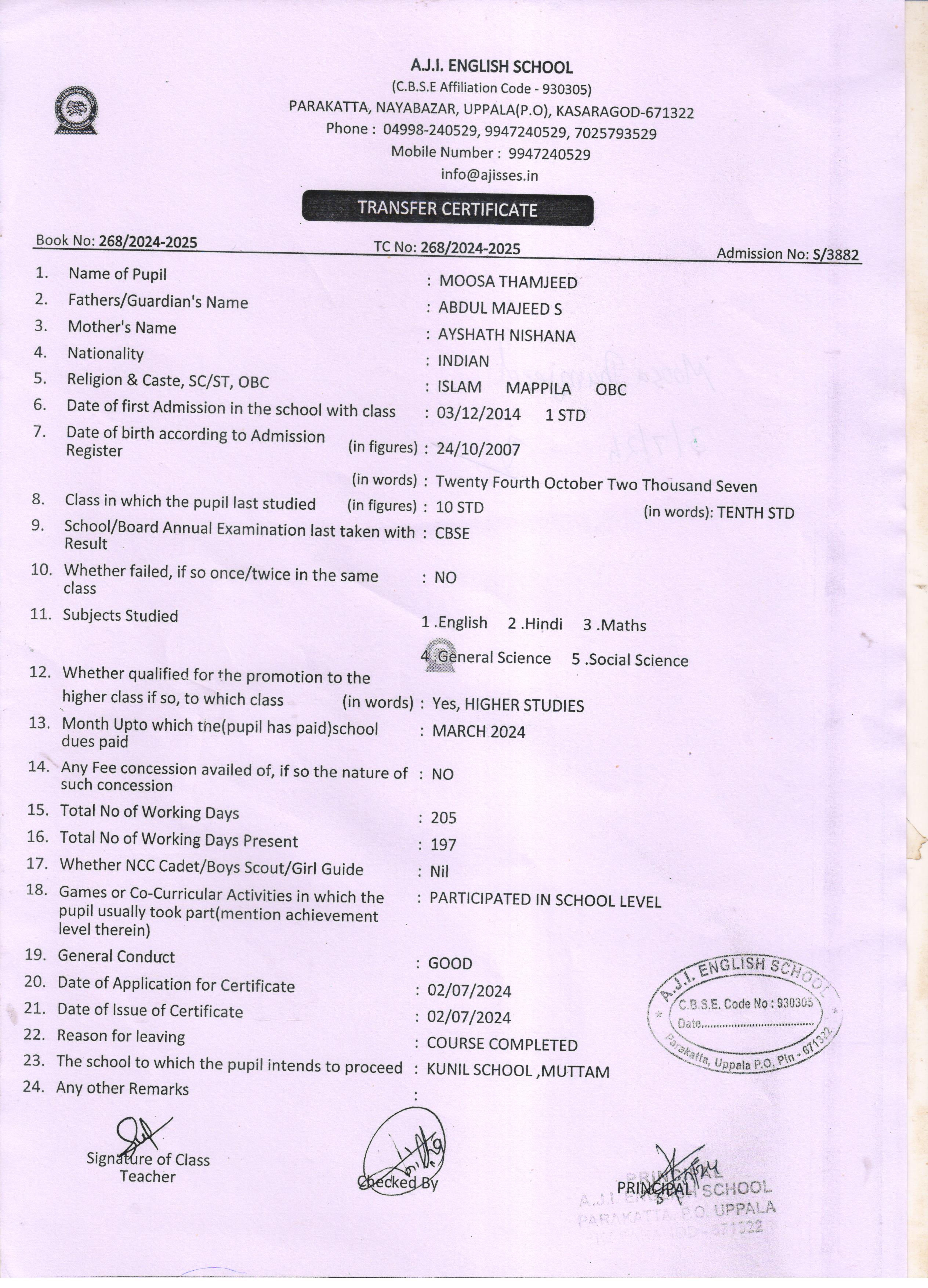 | 285. | MOOSA THAMJEED | TCNO.268/2024-25 | View |