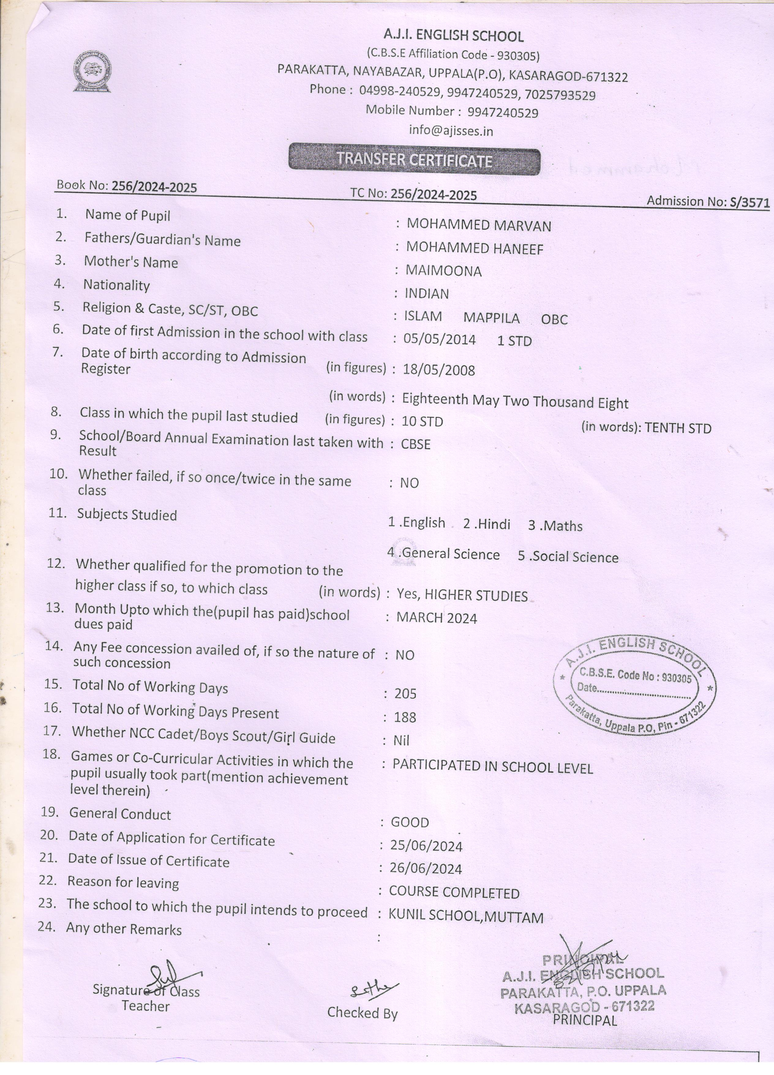 | 265. | MUHAMMED MIDLAJ 7-STD | TC NO: 54/2024-2025 | View |