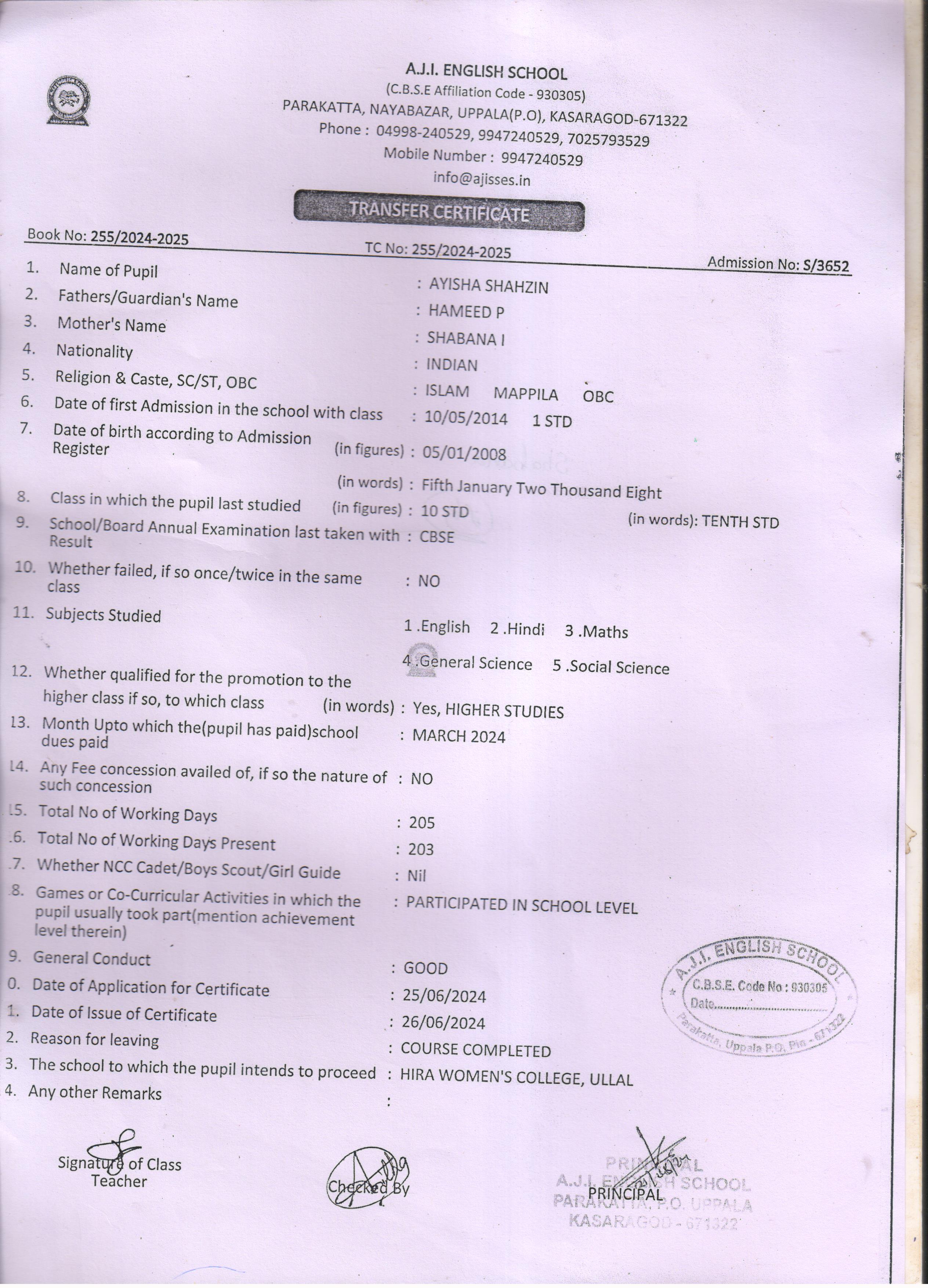 | 288. | AYSHA SHAHZIN | TC NO.255/2024-25 | View |