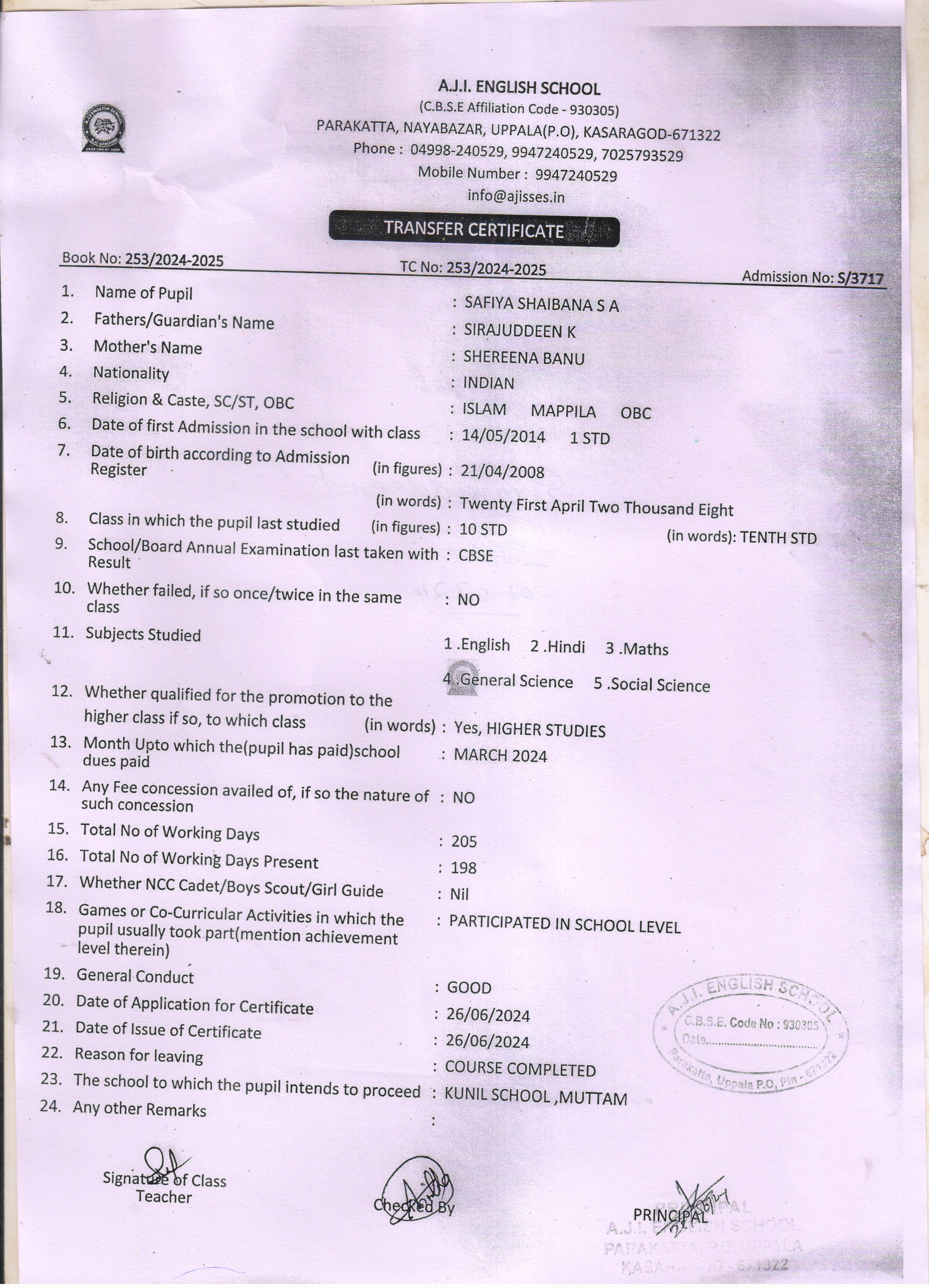 | 289. | SAFIYA SHAIBANA S A | T C NO 253/2024-25 | View |