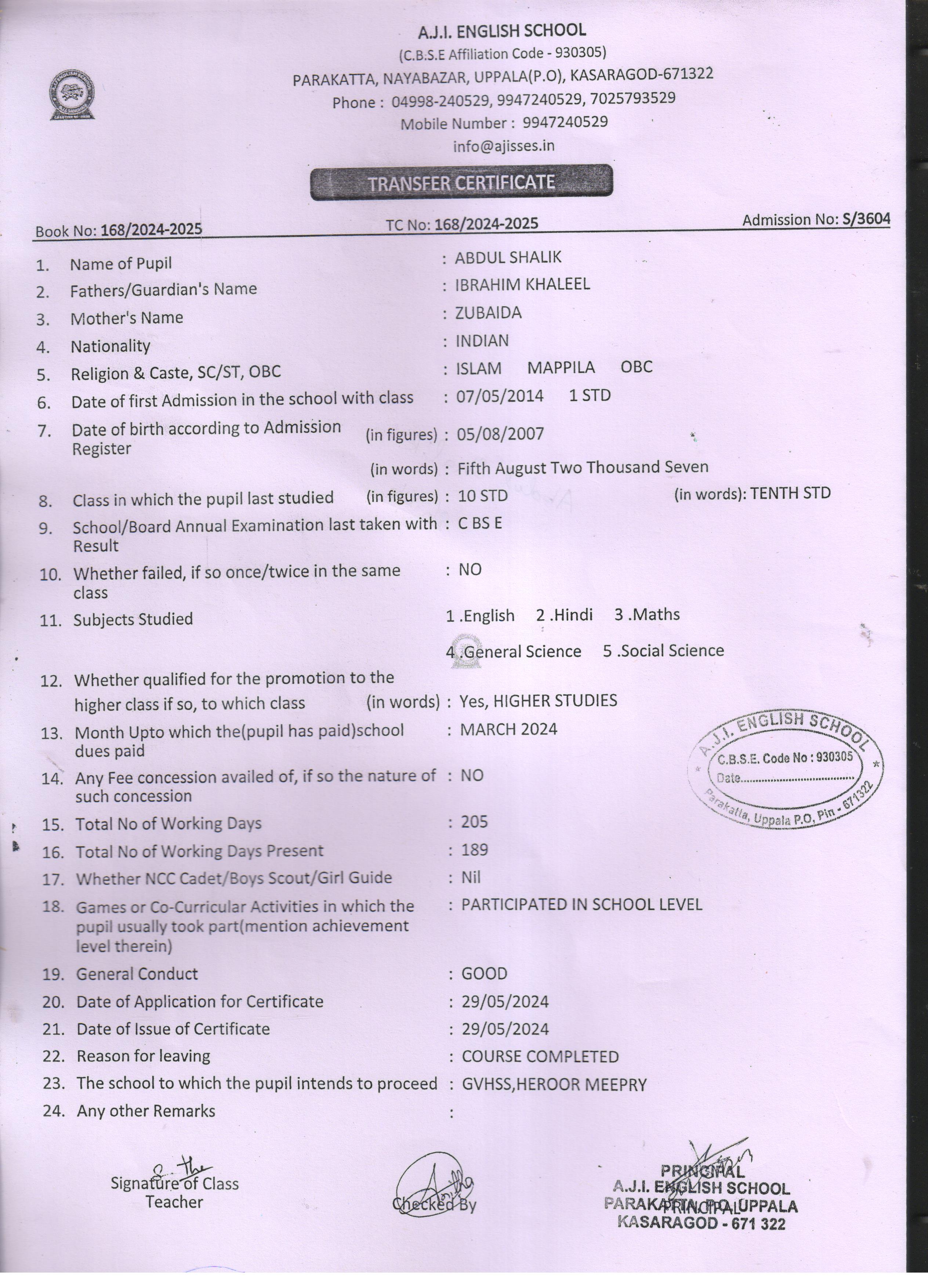 | 276. | IBRAIM ZAMIL MOHAMMED 9-STD | TC NO: 185/2024-2025 | View |