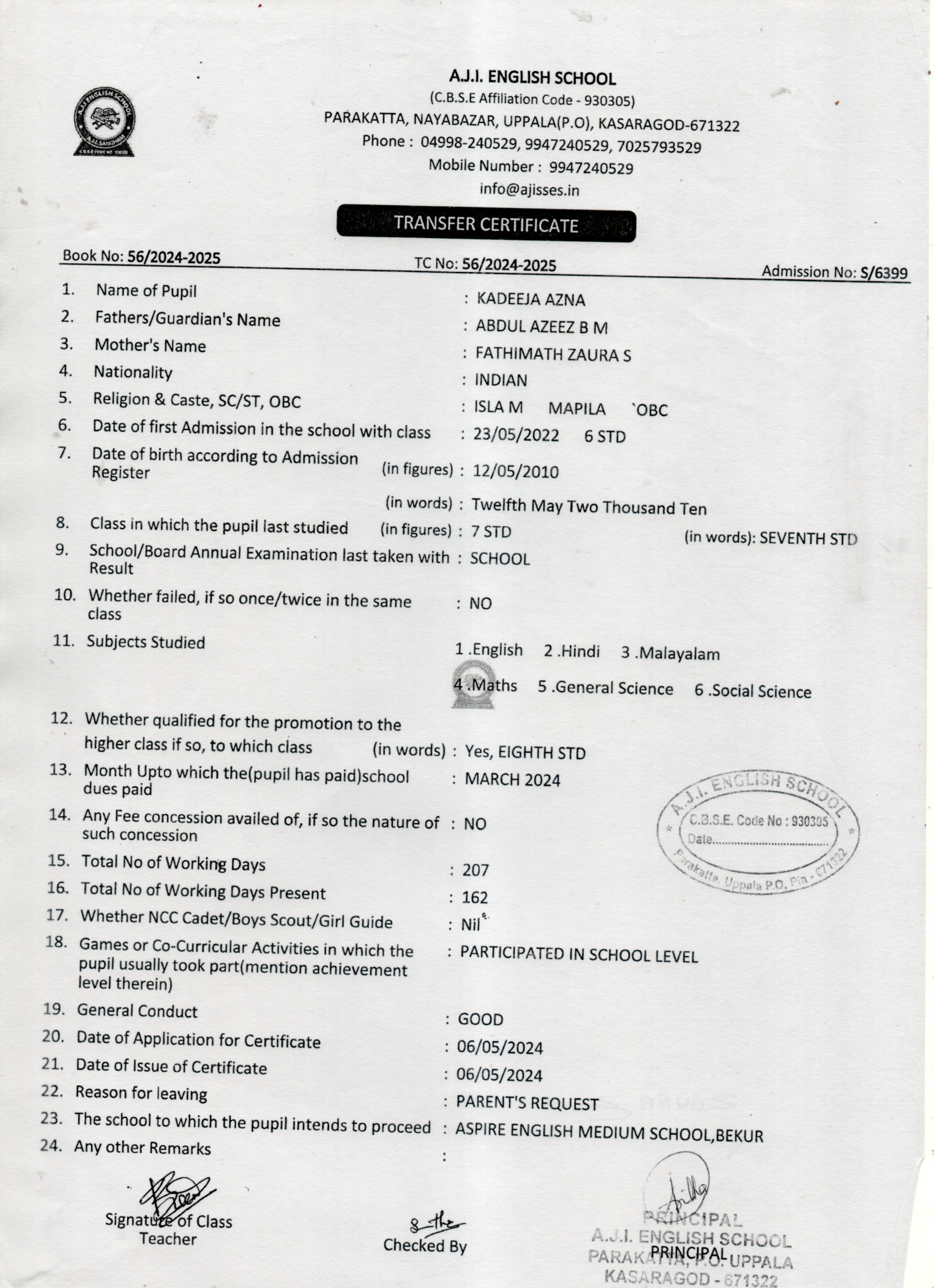 | 264. | KADEEJA AZNA 7-STD | TC NO: 56/2024-2025 | View |