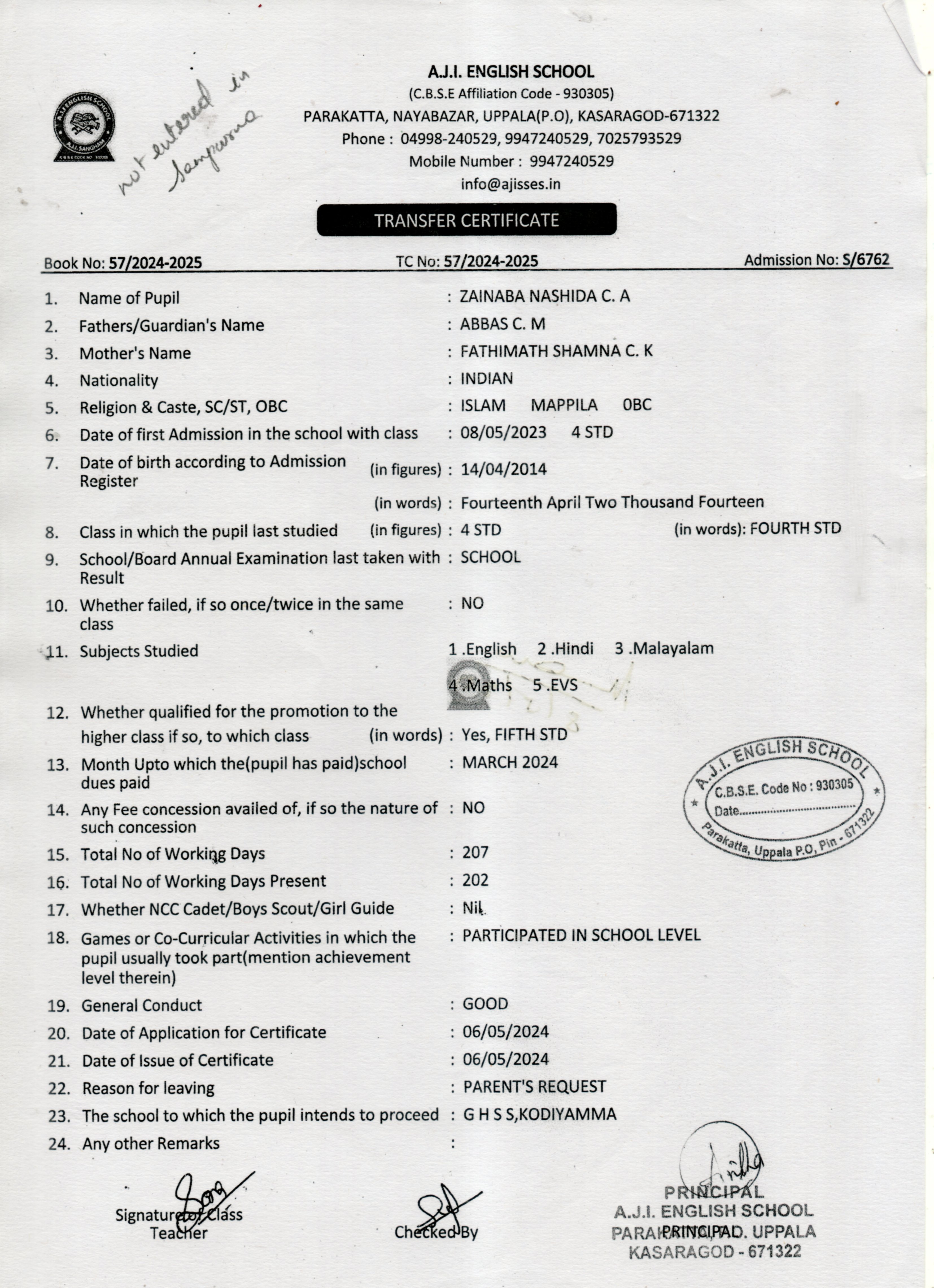 | 266. | ZAINABA NASHIDA C A 4-STD | TC NO: 57/2024-2025 | View |