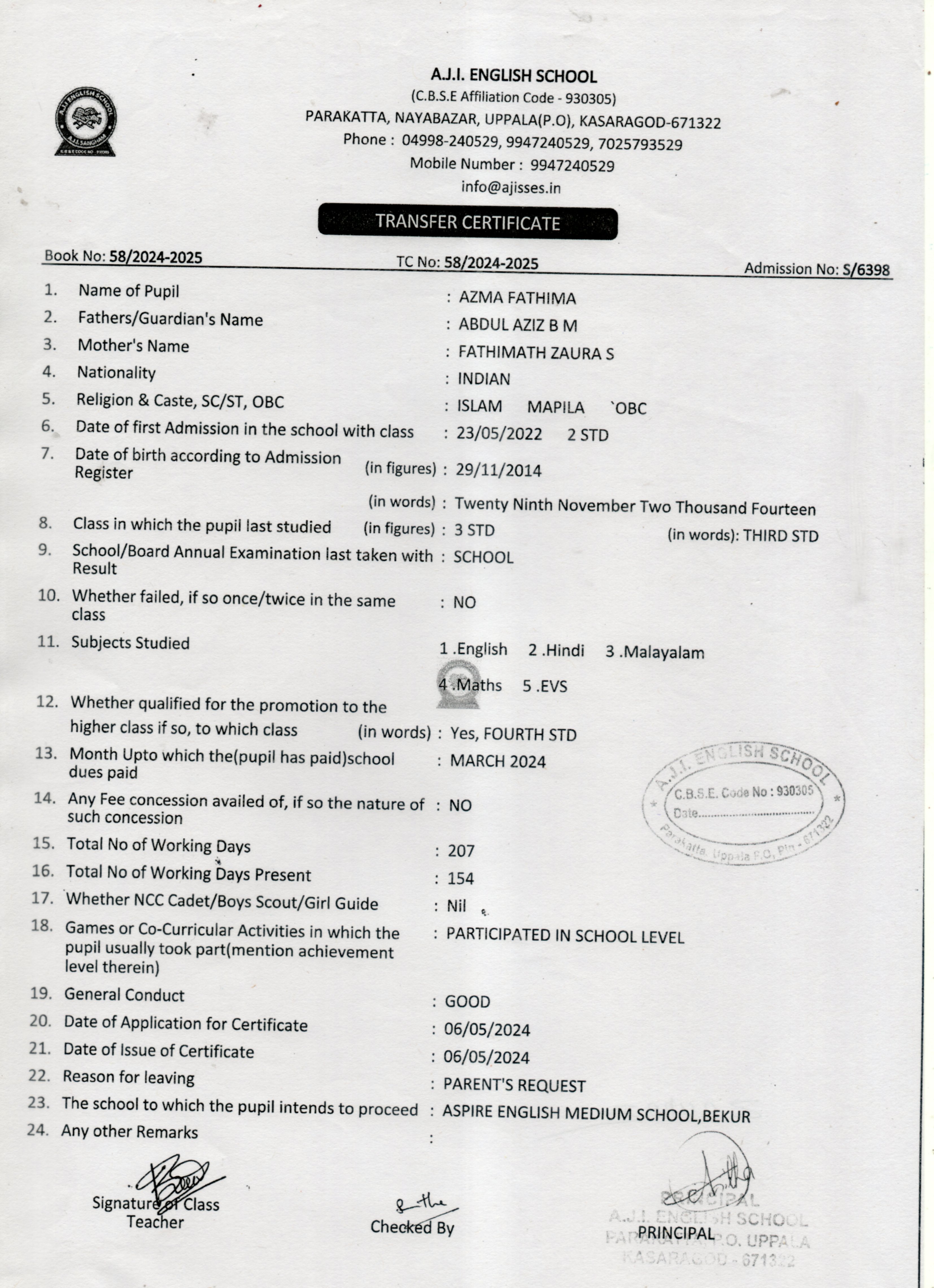 | 253. | AMEENA MADIHA 6-STD | TC NO: 80/2024-2025 | View |